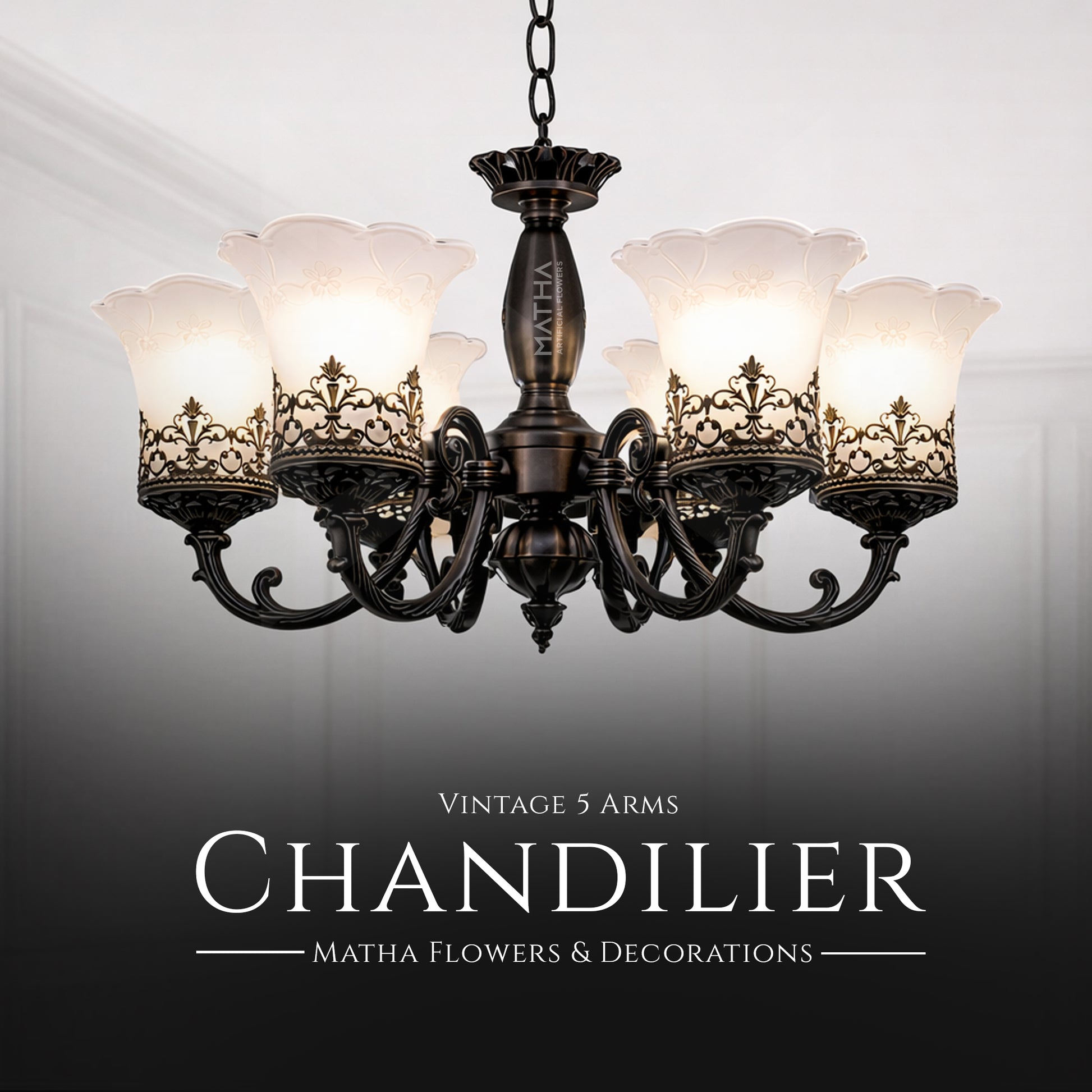 Indha chandelier oru classic + luxury combination design. Light brass gold finish la irukum metal body, smooth matte shine kudukkum – romba over gold illa, subtle royal look.
